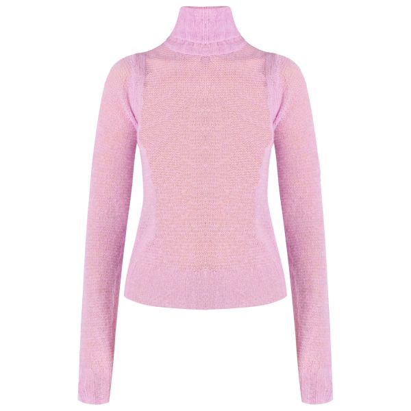 Розовый трикотажный гольф полупрозрачной вязки. Откладной воротник-стойка, манжеты и подол в рубчик. Декоративный шов рядом с проймами.