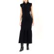 Темно-синее макси-платье с драпировкой на груди. Трикотаж в мелкий рубчик. Приталенный крой без рукавов. Элегантный вырез с воротником-хомутом. Воланы на подоле.