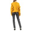 Укороченный шерстяной свитер горчично-желтого цвета. Изделие дополняют рюши в два ряда. Манжеты, подол и горловина в рубчик. Длинные рукава со спущенной линией плеч.