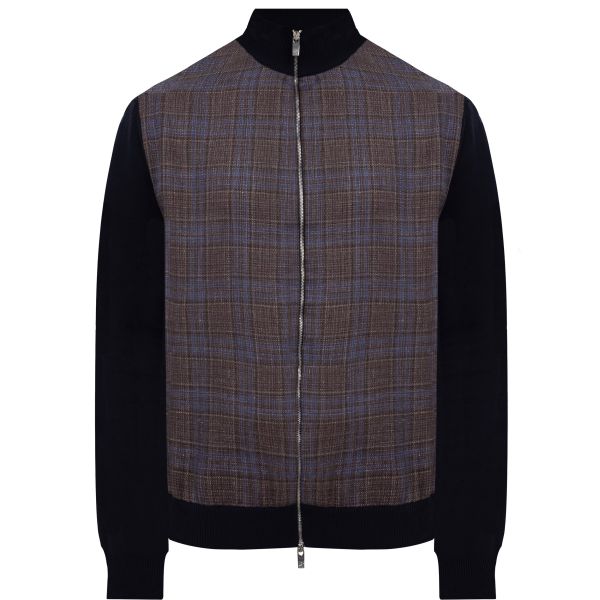 Бомбер от бренда Tombolini с контрастным передом. Вязаные рукава с манжетами. Серебристая молния. Воротник-стойка. Планка на подоле. Прямой крой. Модель с рисунком в клеточку. Рост модели: 183 см. Параметры: 98/83/97. Размер на модели: 52
